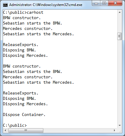 Bei der Ausführung des Programms wird nach container.ComposeParts() (Zeile 14) die Methode OnImportsSatisfied() vom Host aufgerufen. Wird zum ersten Mal auf ein Export zugegriffen, wird von diesem erst der Konstruktor, dann die Methoden OnImportsSatisfied() und StartEngine() ausgeführt.