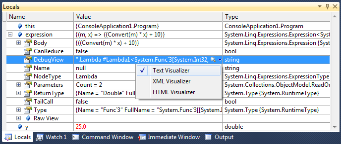 Visual Studio bietet Unterstützung bei der Analyse von Expression Trees. So liefert die Klasse Expression<T> über die Eigenschaft DebugName einen String zurück, der in einer Art Metasprache den Ausdruck näher beschreibt.