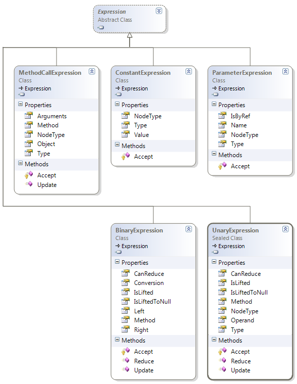 Jeder mögliche Knoten innerhalb eines Expression Trees wird durch die Klasse Expression, bzw. einer der Ableitungen, abgebildet. So gibt es z. B. eine Klasse, die einen Parameter repräsentiert oder einen binären Operator. Hier eine Übersicht der Klassen, die für unser Beispiel von Bedeutung sind:![]()