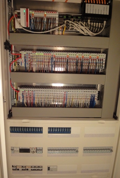 Entsprechende Ein-/Ausgabemodule waren für das Gerät ebenfalls verfügbar. Die Bauform war so kompakt, dass alles zusammen in meinem Sicherungskasten untergebracht werden konnte. Es waren nicht wenige Kabel, die ich verlegen musste. Weildie Taster keine 230V schalten mussten, diese gingen direkt auf 24V-Eingänge der Steuerung, konnte ich deutlich dünnere Kabel verwenden. Nur die schaltbaren Steckdosen, Lampen und Jalousiemotoren wurden mit den üblichen 230V-Kabel verdrahtet. Der Verdrahtungsaufwand war zwar immer noch umfangreich, aber nicht so hoch, dass es nicht umgesetzt werden konnte.
