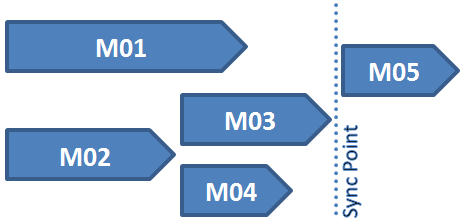 Die folgende Graphik zeigt den zeitlichen Verlauf des Beispiels. Die Tasks M01 und M02 werden parallel gestartet. Erst wenn M02 beendet wurde, sollen M03 und M04 zur Ausführung kommen. Da M05 die Ergebnisse von M01, M03 und M04 benötigt, darf dieser erst nach Beendigung dieser Tasks gestartet werden.