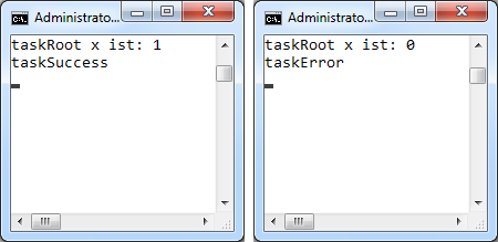 Der Einsatz dieser Option erlaubt interessante Möglichkeiten. Im folgenden Beispiel werden zwei Nachfolge-Tasks erzeugt (Zeile 10 und Zeile 15). Der eine soll nur dann erzeugt werden, wenn taskRoot ohne Fehler beendet wurde. Ein weiterer wird nur im Fehlerfall zur Ausführung gebracht.