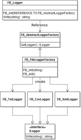 An die Methode FB_init() von FB_Logger wird eine Referenz auf die Klassenfabrik übergeben. Die Klassenfabrik liefert über die Methode GetLogger() die Referenz auf den entsprechenden Funktionsblock (FB_TxtLogger, FB_CsvLogger oder FB_XmlLogger) zurück. Das Anlegen der Instanzen erfolgt jetzt durch die Klassenfabrik, nicht durch den Funktionsblock FB_Logger.