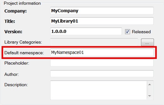 Sehr häufig entspricht der Namespace einer Bibliothek auch dem Namen der Bibliothek (in diesem Beispiel ist dieses nicht der Fall). Bleibt das Feld für den Namespace leer, so wird als Namespace der Name der Bibliothek (das Feld Title) benutzt.