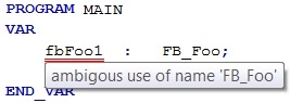 Zwei SPS-Bibliotheken enthalten jeweils den Baustein FB_Foo. Diese beiden Bibliotheken werden einem Projekt hinzugefügt. Der Versuch, eine Instanz eines dieser Bausteine anzulegen führt zwangsläufig zu einer Fehlermeldung. Für den Compiler ist es nicht eindeutig, aus welcher Bibliothek er den Baustein nehmen soll.