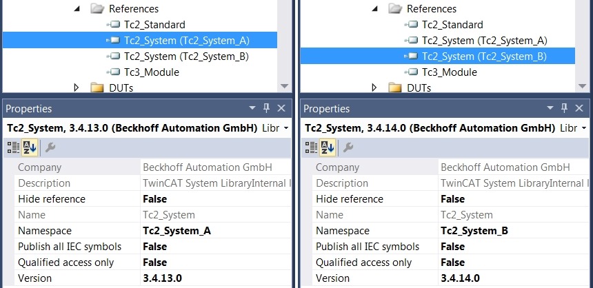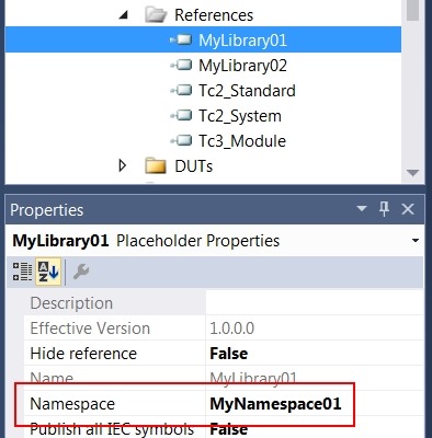 Bei TwinCAT 3 wird dieses Problem mit Namespaces gelöst. Bei jedem SPS-Projekt, und somit auch bei SPS-Bibliotheken, kann ein Namespace bei den Projektinformationen definiert werden. Groß- und Kleinschreibung wird nicht berücksichtigt.
