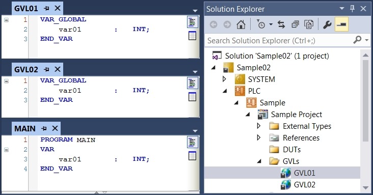 GVL01.var01 := 1; // global variable in GVL01 GVL02.var01 := 2; // global variable in GVL02 var01 := 3; // local variable in MAIN