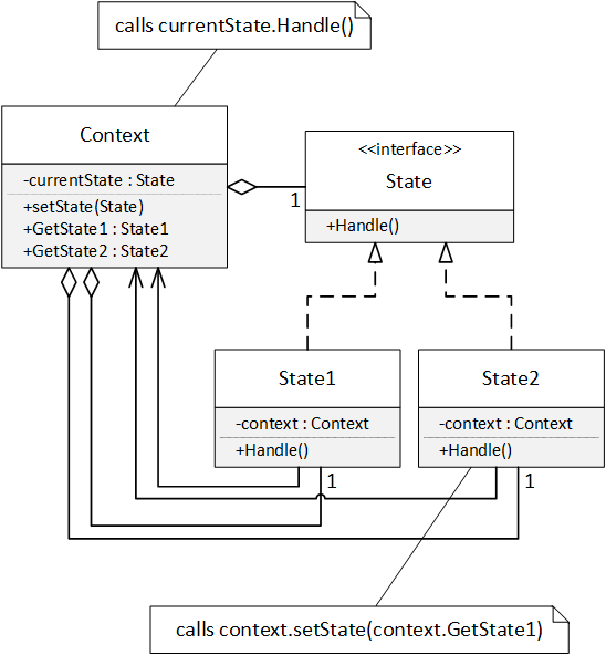Das Objekt, dessen Verhalten in Abhängigkeit vom Zustand geändert werden soll (Context), aggregiert (kapselt) ein solches Zustandsobjekt. Dieses Objekt repräsentiert den aktuellen internen Zustand (currentState) und kapselt das zustandsabhängige Verhalten. Der Context delegiert Aufrufe an das aktuell gesetzte Zustandsobjekt.