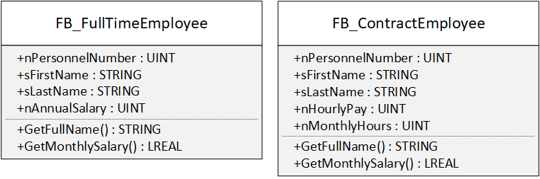 Da beide FBs etliche Gemeinsamkeiten haben, liegt es nahe einen Basis-FB (FB_Employee) zu erstellen. Dieser Basis-FB enthält alle Methoden und Eigenschaften, die in beiden FBs enthalten sind. Da sich aber die Methoden GetMonthlySalary() in der Implementierung unterscheiden, wird diese in FB_Employee als abstract gekennzeichnet. Dadurch müssen alle FBs, die von diesen Basis-FB erben, GetMonthlySalary() überschreiben.