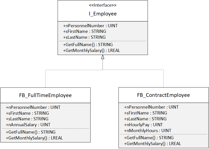 Ein Ansatz mit Schnittstellen ähnelt sehr stark der vorherigen Variante. Die Schnittstelle enthält alle Methoden und Eigenschaften, die bei beiden FBs (FB_FullTimeEmployee und FB_ContractEmployee) gleich sind.