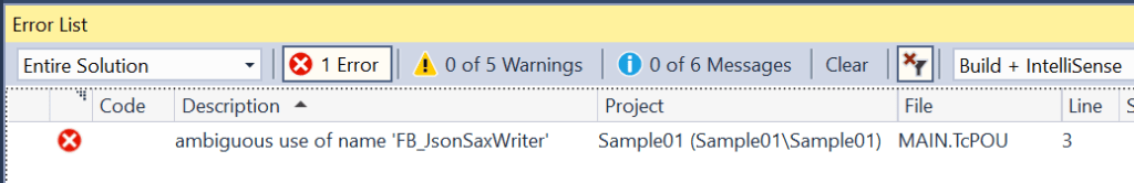 Der Name FB_JsonSaxWriter kann nicht eindeutig aufgelöst werden, da von der Bibliothek Tc3_JsonXml zwei verschiedene Versionen (V3.3.7.0 und V3.3.14.0) in dem Projekt vorhanden sind. Somit ist auch FB_JsonSaxWriter in dem Projekt zweimal enthalten.