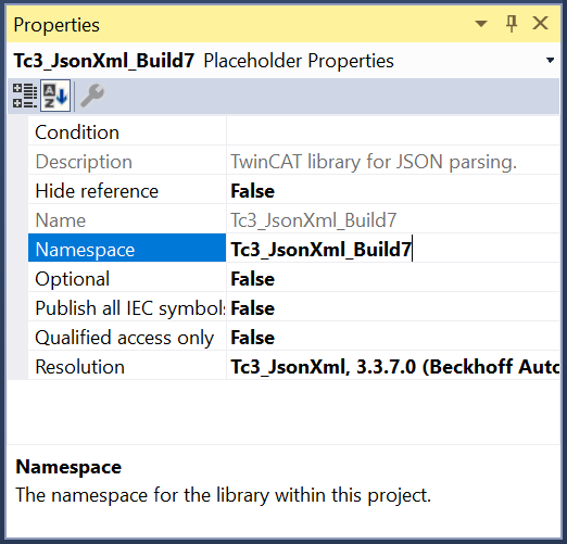 Hier muss der Namensraum noch angepasst werden. Der Namensraum wird später im SPS-Programm verwendet und dient dazu, Elemente beider Bibliotheken über unterschiedliche Bezeichner anzusprechen. Das Grundkonzept von Namensräumen hatte ich unter IEC 61131-3: Namensräume vorgestellt. Für den Namensraum habe ich die gleichen Bezeichner gewählt, wie für die Platzhalter.