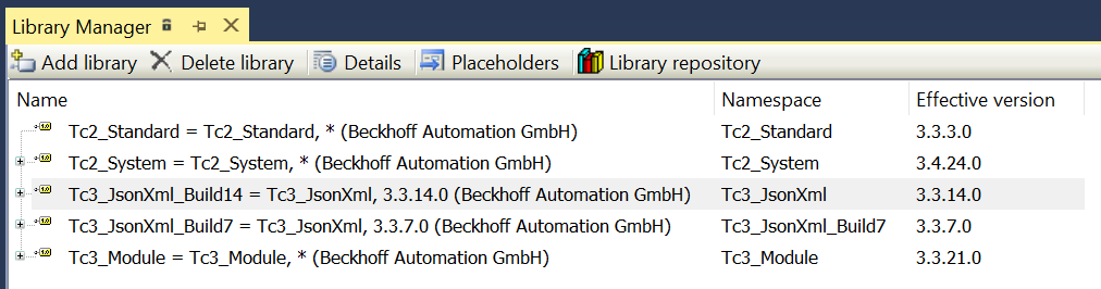 Hier ist gut zu erkennen, wie die Platzhalter aufgelöst werden. In der Regel haben die Platzhalter den gleichen Namen wie die Bibliotheken, auf die verwiesen wird. Das ‚*‘ bedeutet, dass immer die neuste Version der Bibliothek verwendet wird, die auf dem Entwicklungsrechner vorhanden ist. In der rechten Spalte wird die Version angezeigt, auf die der Platzhalter verweist. Für die beiden Platzhalter der Tc3_JsonXml Bibliothek wurden die Namen der Platzhalter angepasst.