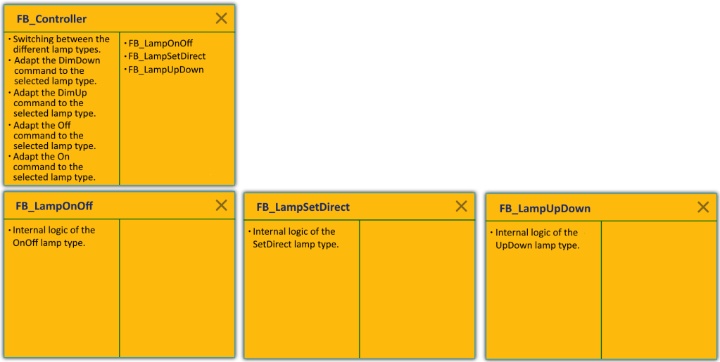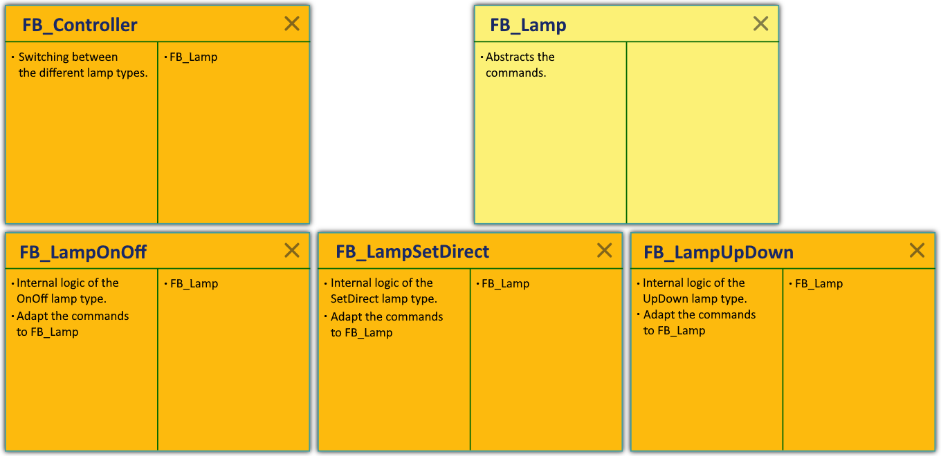 A higher-level controller (FB_Controller) provides access to a single application programming interface (API) for addressing the three lamp types. The Dependency Inversion Principle (DIP) is applied to avoid having a fixed dependency between the controller and lamp types. The unitary API is defined by I_Lamp. The I_Lamp interface is implemented by the abstract function block FB_Lamp. FB_Lamp contains identical program code for all three lamp types. Having all lamp types derived from FB_Lamp means that the controller and lamps are decoupled. Instead of creating instances of specific lamp types, the controller manages just a single reference to FB_Lamp.