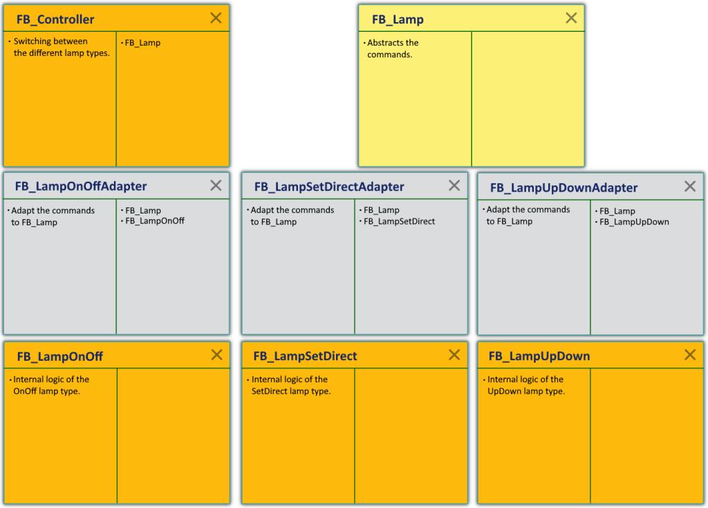 To bring this setup in line with the Single Responsibility Principle, we use the adapter pattern. Each lamp type now has an adapter function block responsible for mapping between the abstract lamp and the specific lamp type.