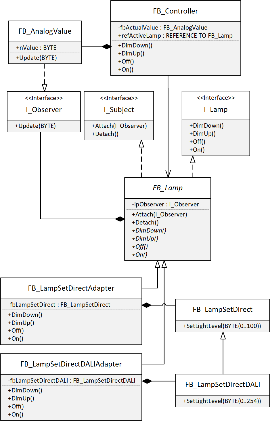 Zur Realisierung der geforderten Funktionsweise, stellt jeder Lampentyp seine eigenen Methoden bereit. Aus diesem Grund besitzt jeder Lampentyp einen entsprechenden Adapter-Funktionsblock (FB_LampOnOffAdapter, FB_LampSetDirectAdapter und FB_LampUpDownAdapter), der für das Mapping zwischen der abstrakten Lampe (FB_Lamp) und den konkreten Lampentypen (FB_LampOnOff, FB_LampSetDirect und FB_LampUpDown) zuständig ist. Unterstützt wird diese Optimierung durch das IEC 61131-3: SOLID – Das Single Responsibility Principle (SRP).