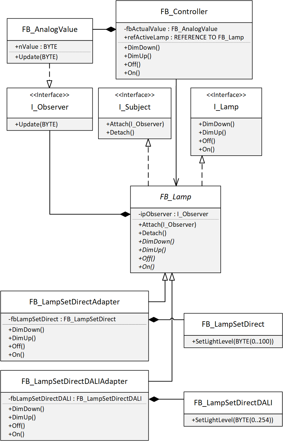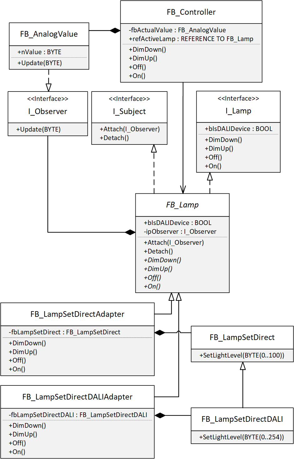 Im UML-Diagramm ist zu erkennen wie FB_Lamp über die Schnittstelle I_Lamp die Eigenschaft bIsDALIDevice erhält und somit von allen Adapter-Funktionsblöcken geerbt wird: