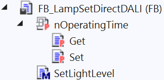 Since FB_LampSetDirectDALI supports the operating hours counter, the adapter (FB_LampSetDirectDALIAdapter) overwrites the nOperatingTime property. The getter and the setter from the adapter access nOperatingTime from FB_LampSetDirectDALI. In this way, the value of the operating hours counter is passed on to FB_Controller.