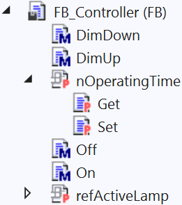 The getter and the setter of nOperatingTime in FB_Controller can thus directly access nOperatingTime of the individual adapters of the lamp types. The getter of FB_Lamp (abstract function block from which all adapters inherit) returns the value -1. The absence of the operating hours counter can thus be detected.