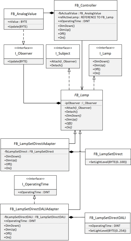 In the last post (IEC 61131-3: SOLID – The Liskov Substitution Principle), the example was extended by another lamp type (FB_LampSetDirectDALI). The special feature of this lamp type is the scaling of the output value. While the other lamp types output 0-100%, the new lamp type outputs a value from 0 to 254.